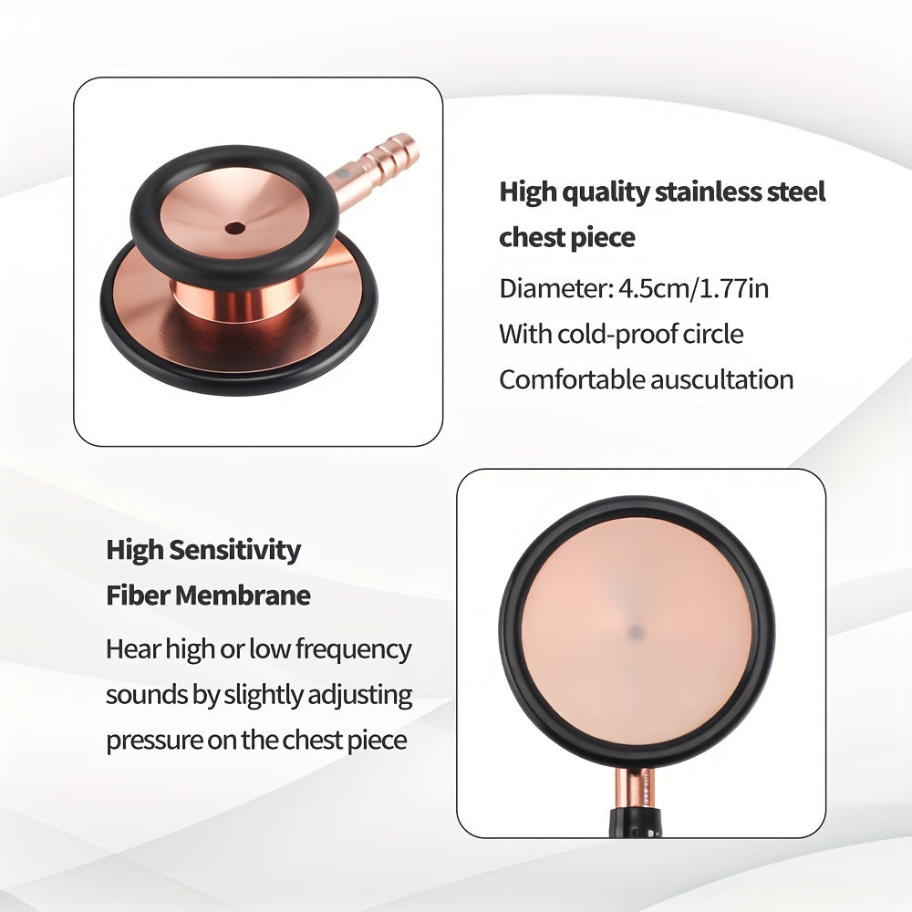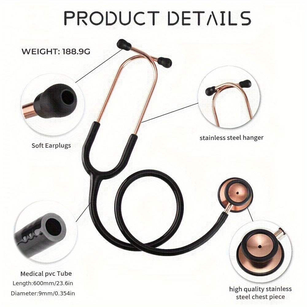Dieses hochwertige Stethoskop kombiniert präzise Akustik mit einem eleganten schwarz-goldenen Design. Das empfindliche Bruststück ermöglicht eine klare Auskultation von Herz-, Lungen- und Gefäßgeräuschen, während das robuste Material für eine lange Lebensdauer im medizinischen Alltag sorgt.